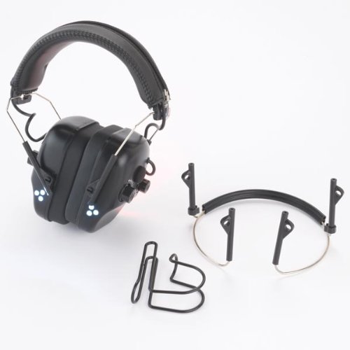 Hyskore , Thats a lot of words for a set of muffs, but these protect your hearing with loads of options. They have an NNR 24 rating with four modes of operation: completely passive, electronic enhanced with cutout or clipping, electronic enhanced noise compression, and a communication mode with a jack plus two accessory cords so you can listen to an MP3 player or plug in a communication device. They also feature six powerful white LED forward facing headlights (three on each ear cup) and two red LED rearward facing taillights (two on each ear cup) which can be used as all on, rear only on, or forward only on. We found the forward facing lights very useful in our shop and around the house. Muffs can be used in a standard over-the-head configuration or behind the neck with the included neckband. Comes with a wire belt clip and instructions. Requires 4 AA batteries, two for electronic options and two for lights (not included).
